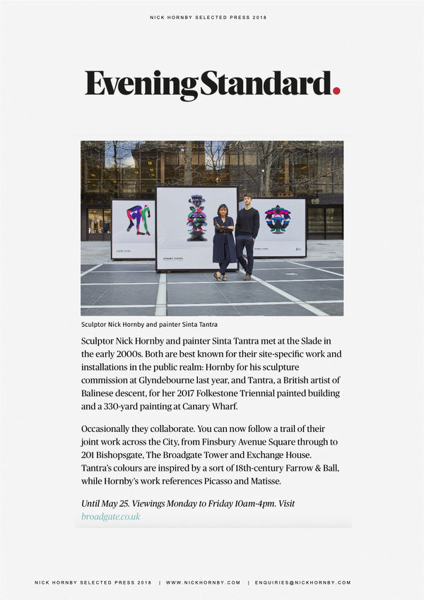 This exhibition is presented over several locations at Broadgate : Exchange House & 201 Bishopsgate are showcasing a series of brightly painted sculptures made between 2013 and 2014. The Broadgate Tower is displaying a sequence of new works developed this year – sketches, digital renders and proposals, alongside a presentation of public art proposals and models, including Tantra’s 2017 Folkestone Triennial painted building and Hornby’s 2018 Harlow sculptural commission. In addition to these internal exhibitions, visitors can enjoy an outdoor collaborative presentation in Finsbury Avenue Square plus a solo sculpture by Nick Hornby situated within in Exchange Square. Exact time and date details for each display are available at Broadgate.co.uk.