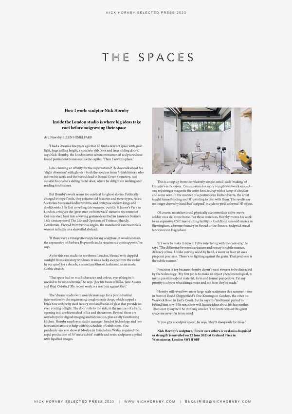 Nick Hornby is one of the leading sculptors of his generation working in Britain today, creating works at the intersection of art history and contemporary technology on both intimate and monumental scales. For more information see www.nickhornby.com