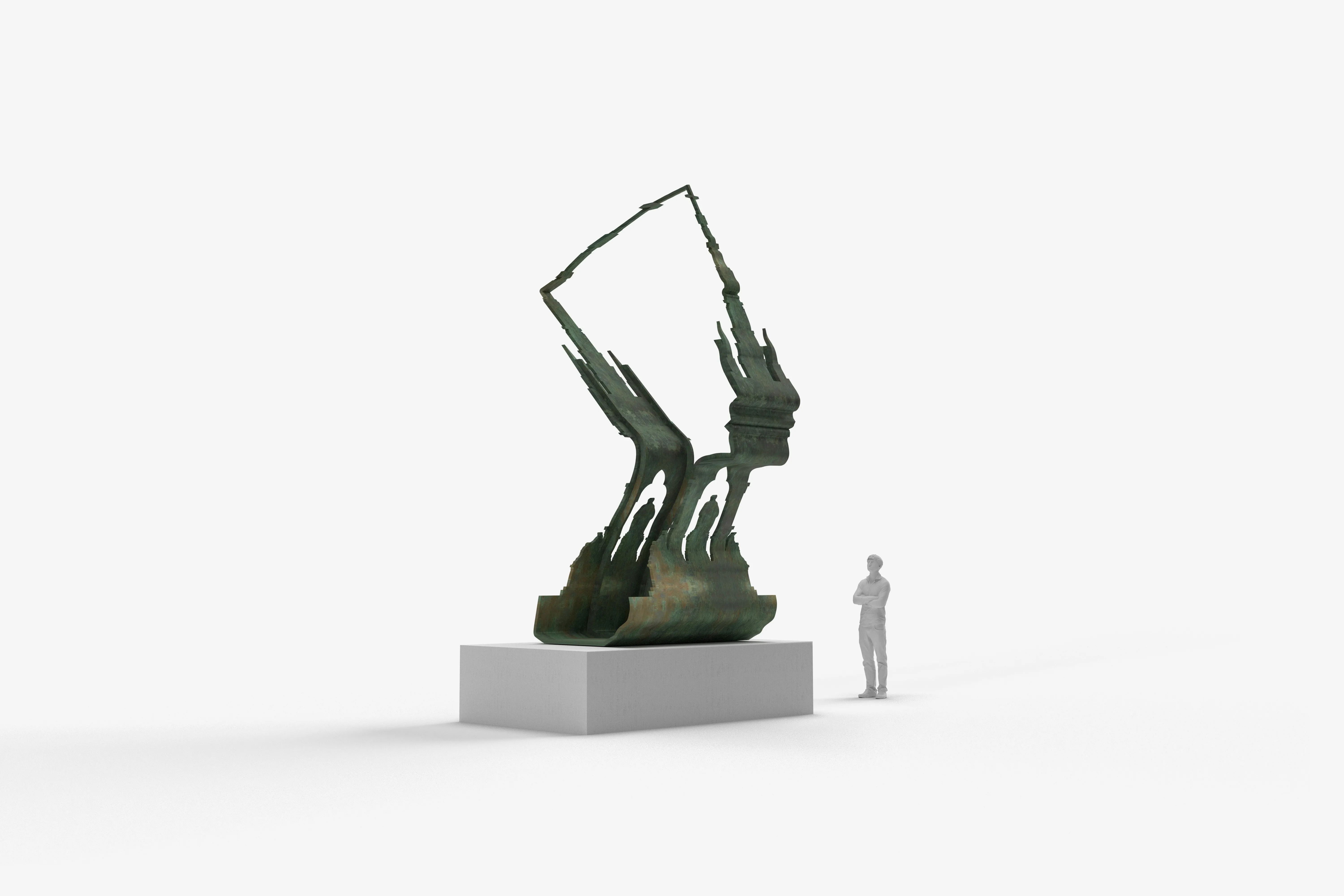 All three change play on a sense of distortion and changing perspectives, enabled by Hornby’s new technical process: he first renders digital models, before rolling them flat into sections to laser cut. “Then we bend 18-millimetre steel back into the shape of the curving line. It’s a really fun process,” he says. “As you walk around the objects, the image components dissolve in and out of view. In that way, they address the debate around the monument and toppling statues,” he says.
