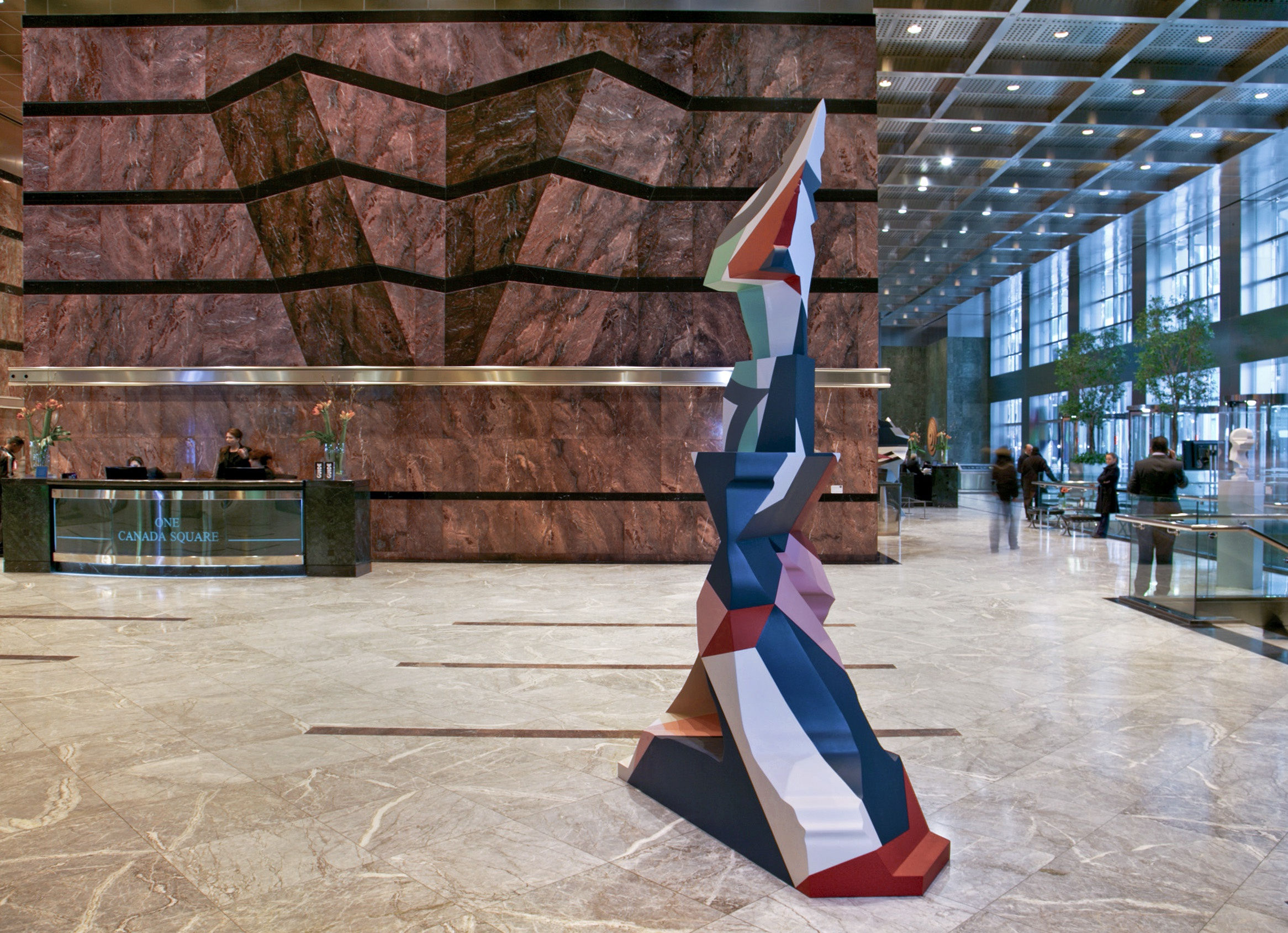 Sinta Tantra, who graduated from the RA Schools in 2006, is acclaimed for kaleidoscopic works in cut vinyl and paint that cover the walls both inside and outside of buildings. Her latest exhibition in the lobby of Canary Wharf tower – nearby where she recently painted geometric designs across both sides of 150 metre-long bridge – is a collaboration with sculptor Nick Hornby, an artist who brings together forms from architecture and art history to create strange, semi-figurative, monochrome shapes that stand on the floor like intruders from another planet.