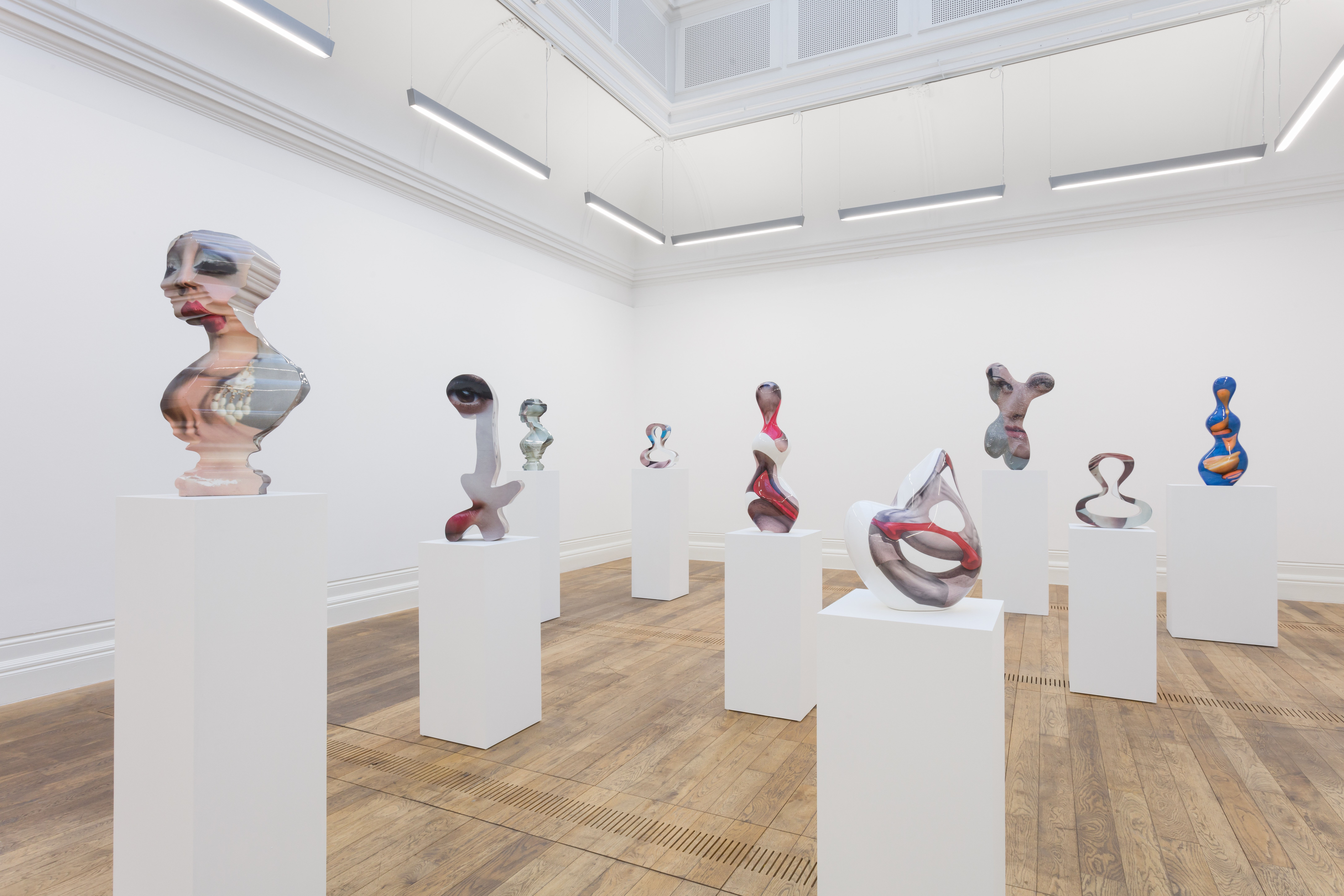 On the Victorian busts it is possible to notice images by the photographer Louie Banks, on the mantelpiece dogs BDSM images and on the abstract forms photos of men in bathing suits. In the destruction of gender stereotypes and the exaltation of free sexuality, eros is a central theme of Hornby’s work. The shapes of the male bodies in the photographs stand out through a seductive and captivating gossamery lack of clarity, stimulated by the undulating, enveloping shapes and the sculptures' translucent surfaces. Their lustre attracts the viewers, almost inviting them to touch the works. The intimacy and carnality of touch, in addition to sight, thus becomes a fundamental sense of research, discovery and feeling.